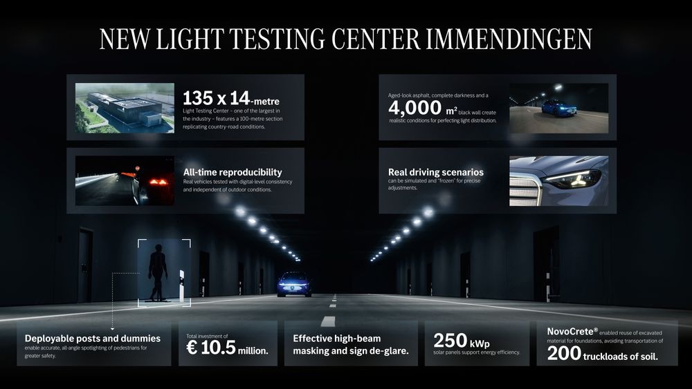 Mercedes-Benz rozšířil své testovací centrum automobilového osvětlení v německém Immendingenu. Světelný tunel s délkou 135 metrů a výškou 8 metrů patří k největším v automobilovém průmyslu. Umožňuje podrobné testování světlometů za konstantních, reprodukovatelných podmínek – nezávisle na denní době nebo počasí. Souběžně zde lze zkoušet až pět automobilů, včetně simulace protijedoucích vozidel nebo procházejících chodců.
